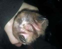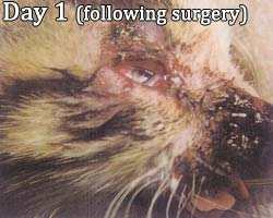 Rescued from the side of the road, this 12–week old kitten had apparently been tossed out of a car window. He had lost part of his nose and sinus and had severe abrasions. Due to his age and the severity of his injuries, only loose stitches could initially be applied. Banixx was used to flush the debris and infection. The stitches did not hold, so the treatment of choice was to drip Banixx onto the cat’s face twice daily.