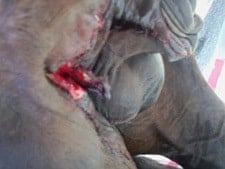 During a routine “collection” procedure our Friesian was impaled on a pipe that was 4.6 feet tall. (He was supposed to mount a phantom) It impaled him in the hind end between his right testicle and his interior haunch. The massive wound was 3 inches across and 6 inches deep. He was rushed to UCD in California. Over the next 4 weeks, he became ill from the antibiotics but recovered.